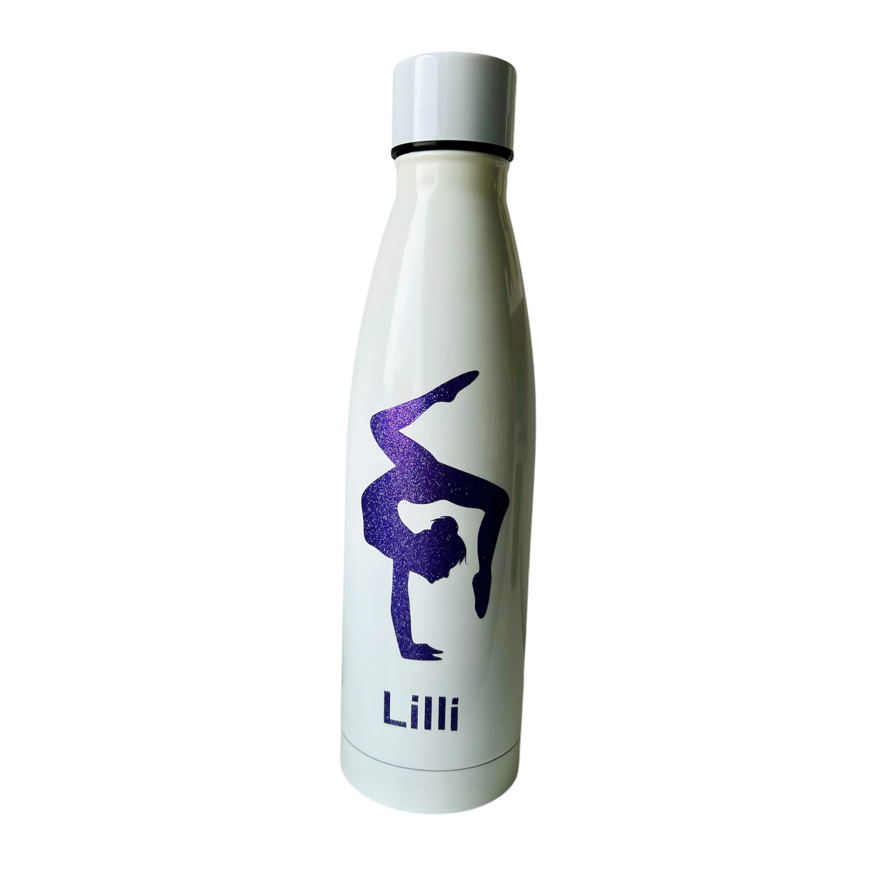 Elegante, weiße Trinkflasche aus doppelwandigem Edelstahl – ein super Begleiter für jede Turnerin bei Training und Wettkampf! Diese hochwertige Wasserflasche hält deine Getränke zuverlässig kalt oder warm und besticht durch ihr stilvolles Design.