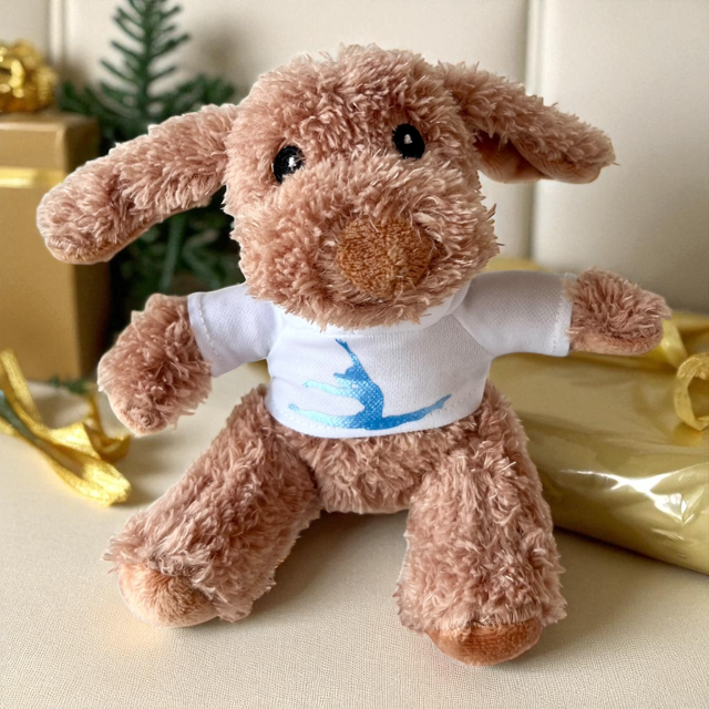 Glücksbringer - ein kleiner Hund im Hoodie Süßer Hund als Maskottchen ca. 12x11x10 cm groß in weißem Hoodie für die Turnerinnen eures Vereins! Der Hoodie wird bedruckt mit dem Turnmotiv und auf dem Rücken mit einem Namen (max. 5 Buchstaben). Die Farbe kann gewählt werden.